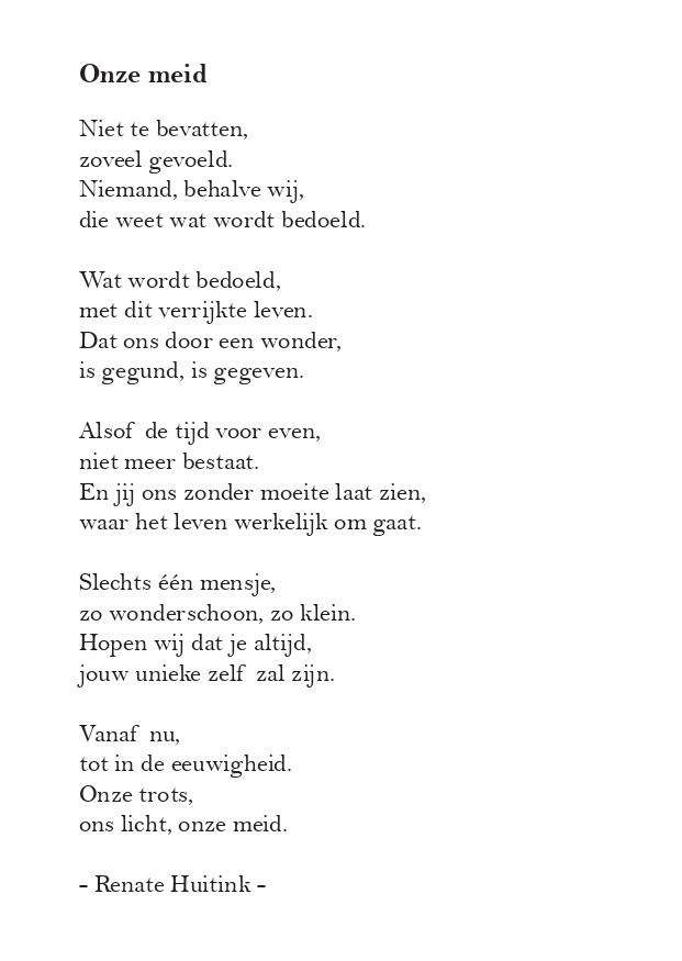 Met een geheel persoonlijk gedicht geef ik vorm aan de emoties die vaak moeilijk in woorden te uiten zijn. Ik zie het als mijn taak om jouw verhaal, jouw unieke ervaring, op een manier te verwoorden die bij jou past.