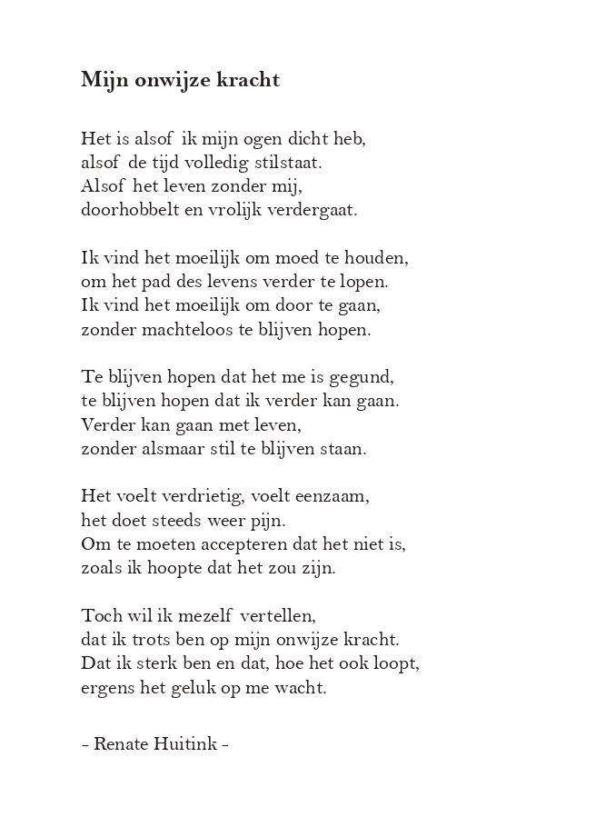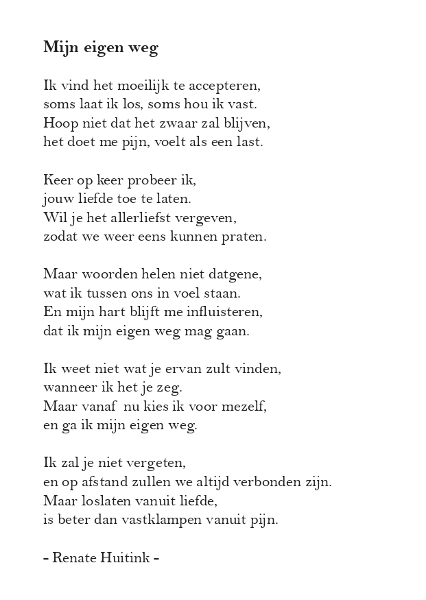 Een persoonlijk gedicht op maat stem ik volledig af op jouw situatie. We hebben contact om de situatie in beeld te brengen, maar juist omdat intense processen lastig zijn om in woorden uit te drukken, zie ik het als mijn taak om jouw verhaal te verdiepen.