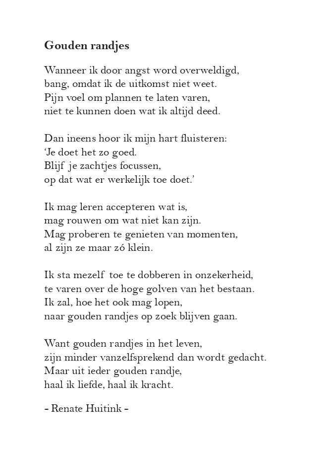 Omdat ik intuïtief schrijf en verder voel dan jouw woorden, zal er altijd een persoonlijke boodschap in het gedicht zitten. Het kan je daarmee helpen diepe inzichten te krijgen in wie je bent en waar je heen wilt.